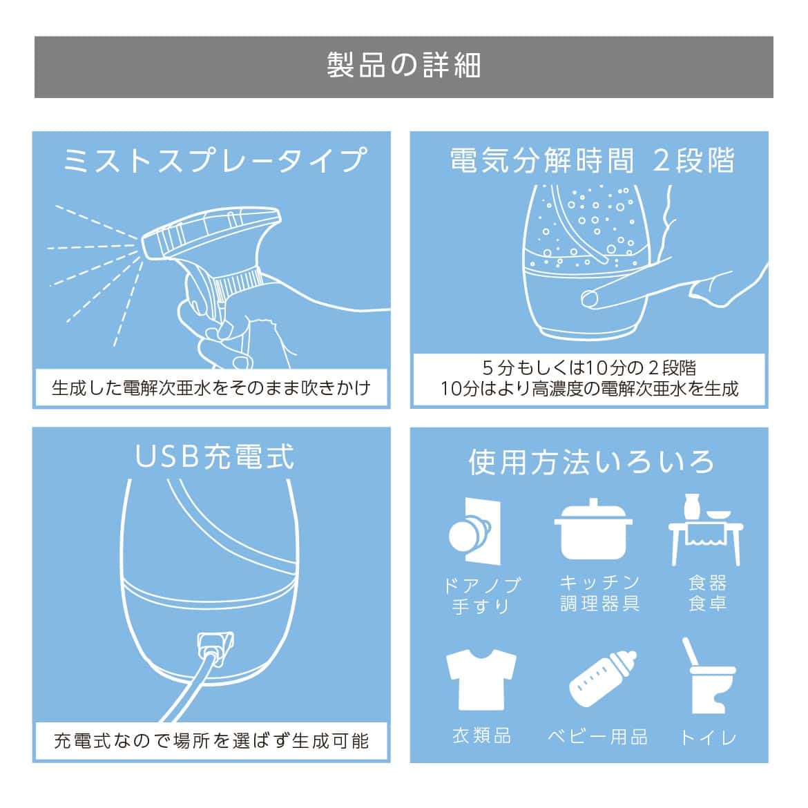 本製品は塩と水を電気分解させ、弱アルカリ性の電解次亜水を生成できます。