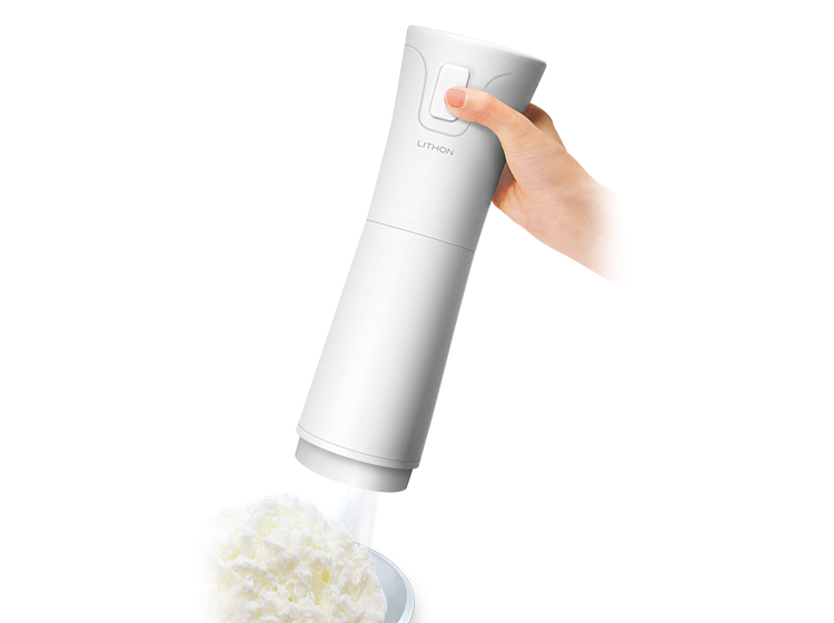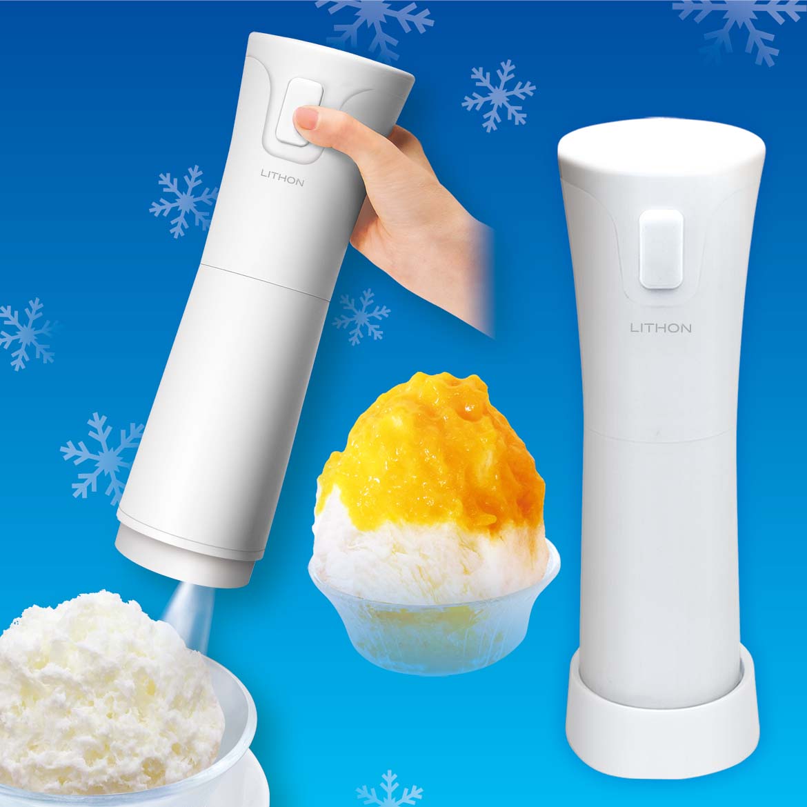 バラ氷を入れて、ボタンを押すだけ簡単操作。ハンディタイプなので器の形を選ばず、手軽にかき氷を作れます。