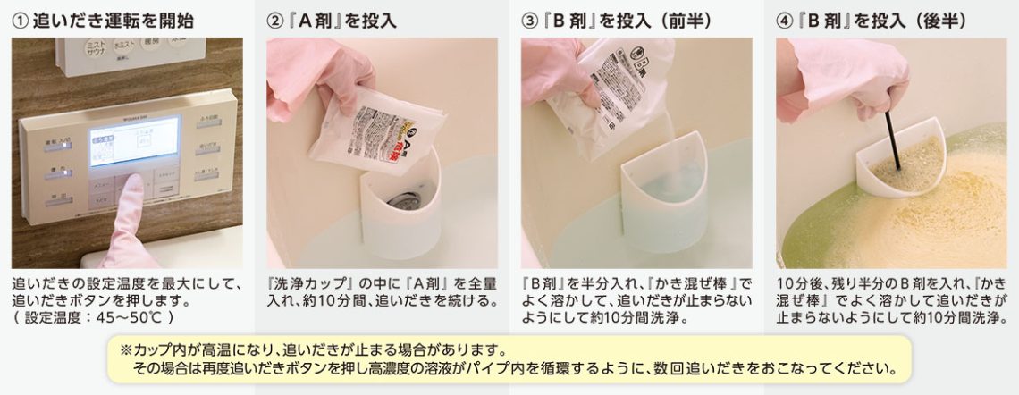 風呂釜の追いだき管内部に蓄積した水アカ・石鹸カス・雑菌・ぬめりを強力に剥がし落とす洗浄剤です。